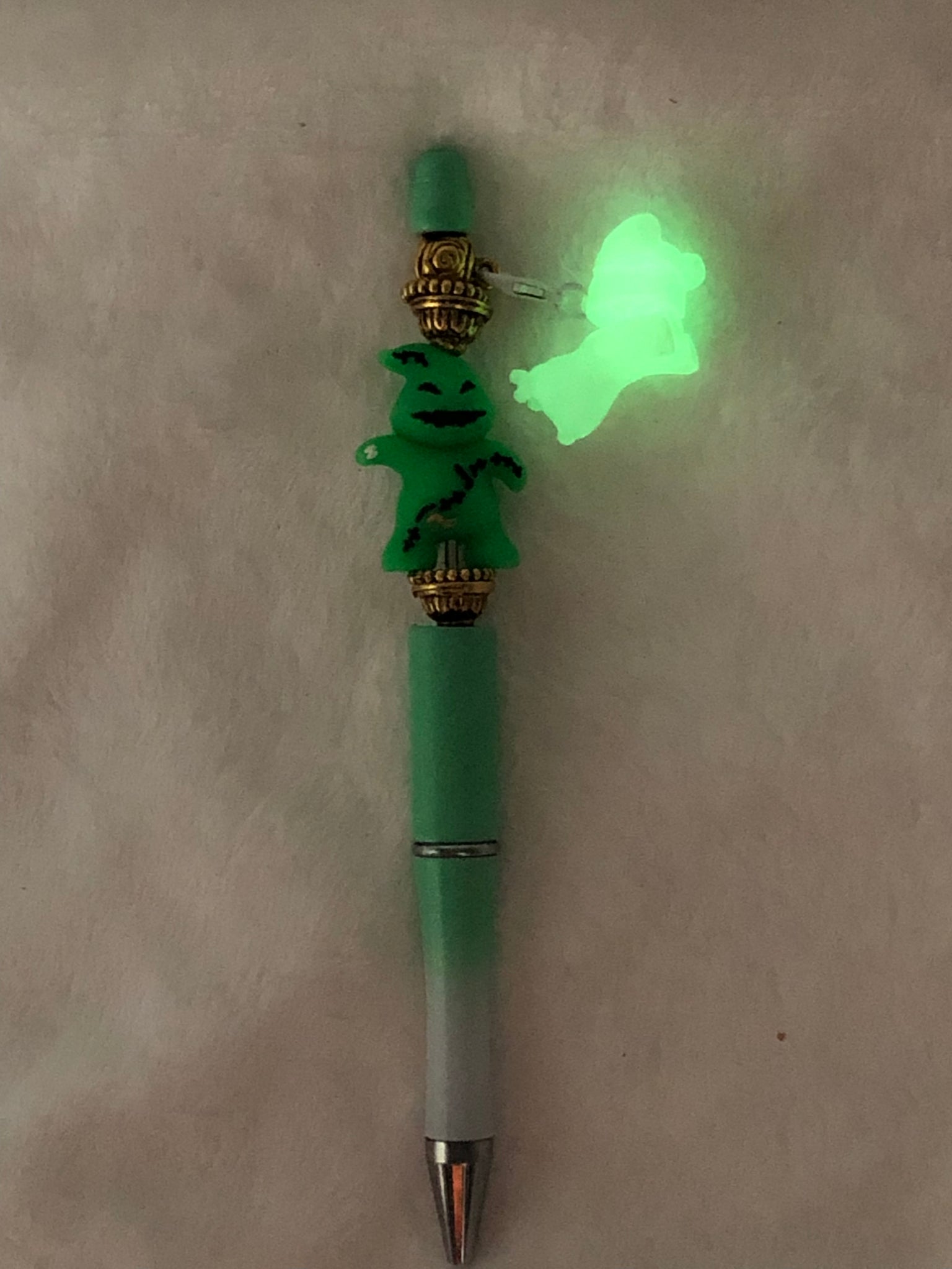 This black ink pen is haunted in the best way possible, topped with a mischievous green ghoul surrounded by golden accents. But here’s the spooky twist—dangling from the top is a glow-in-the-dark ghost charm that lights up the night, making this pen just as fun in the dark as it is in the daylight. The barrel’s green-to-white fade ties it all together in eerie style.