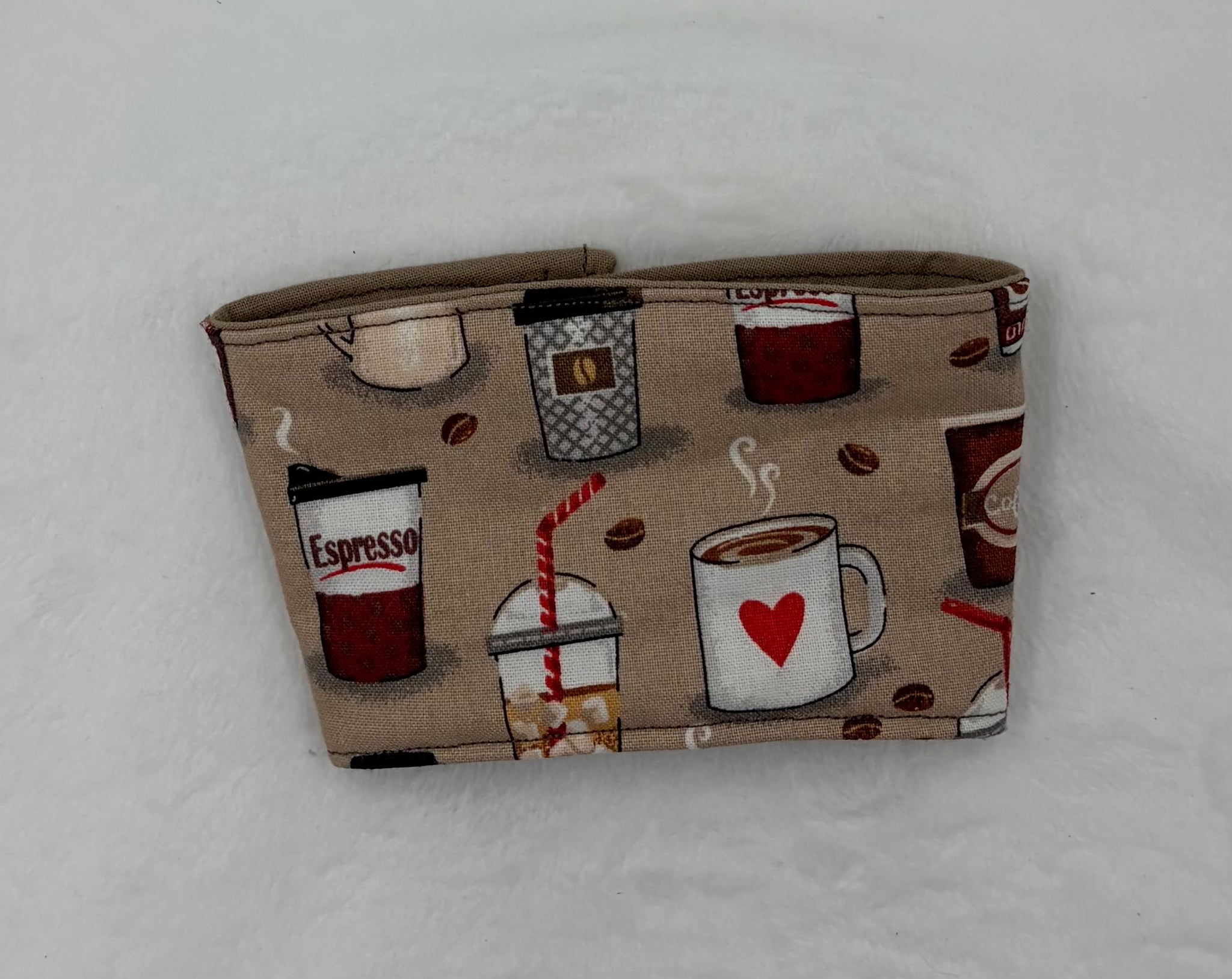 This coffee shop drink cozie sleeve is sprinkled with all your café favourites, from frothy lattes to swirly iced treats, like a menu that came to life and decided to keep your hands comfy. Because the fabric is pre-printed, each sleeve serves up its own unique mix of drinks, so no two are exactly alike… your cup gets its own signature order every time.