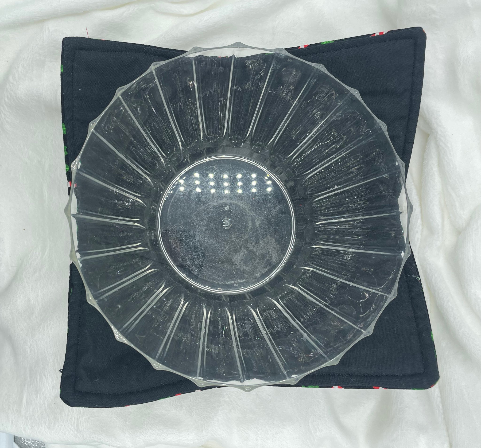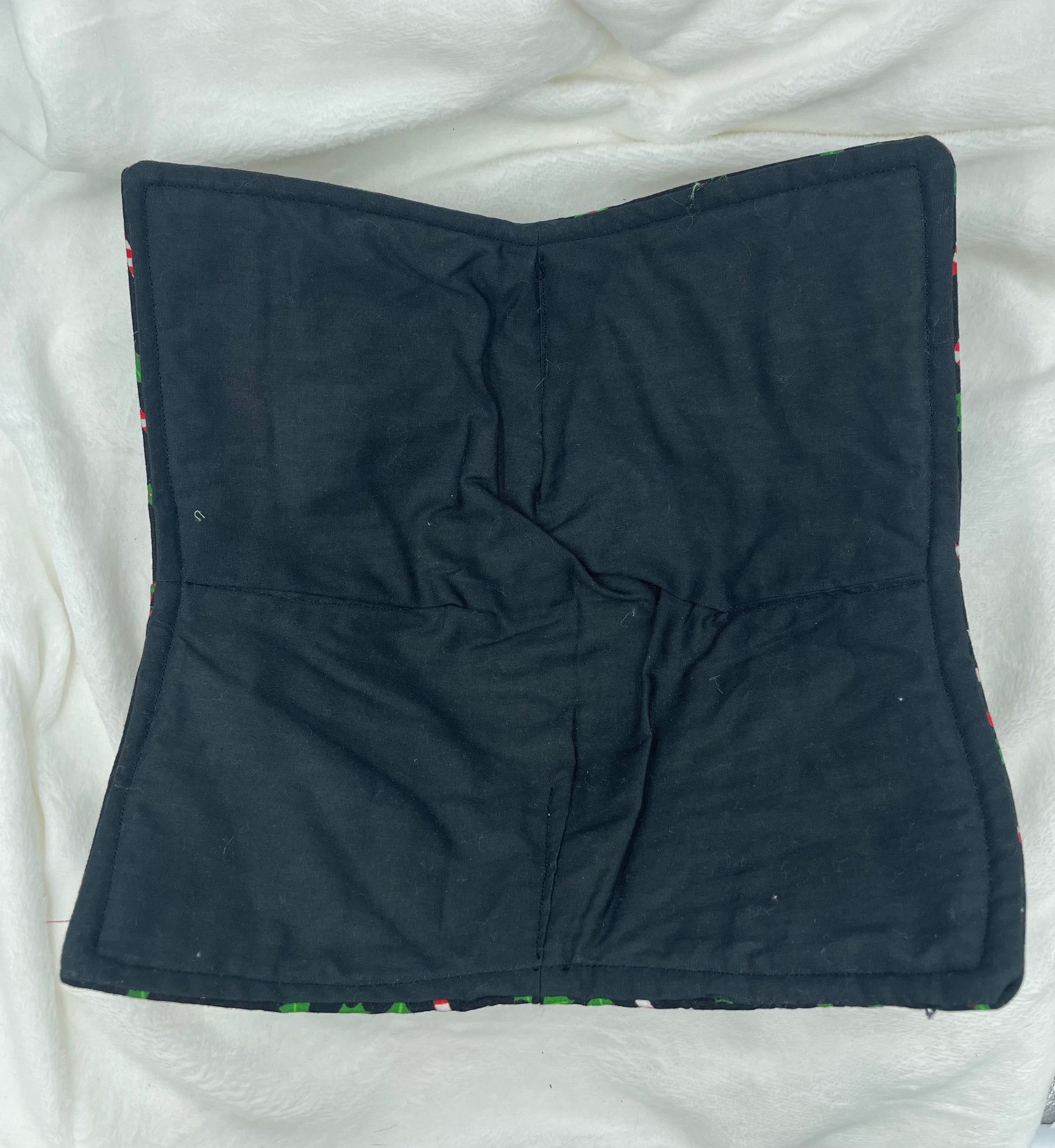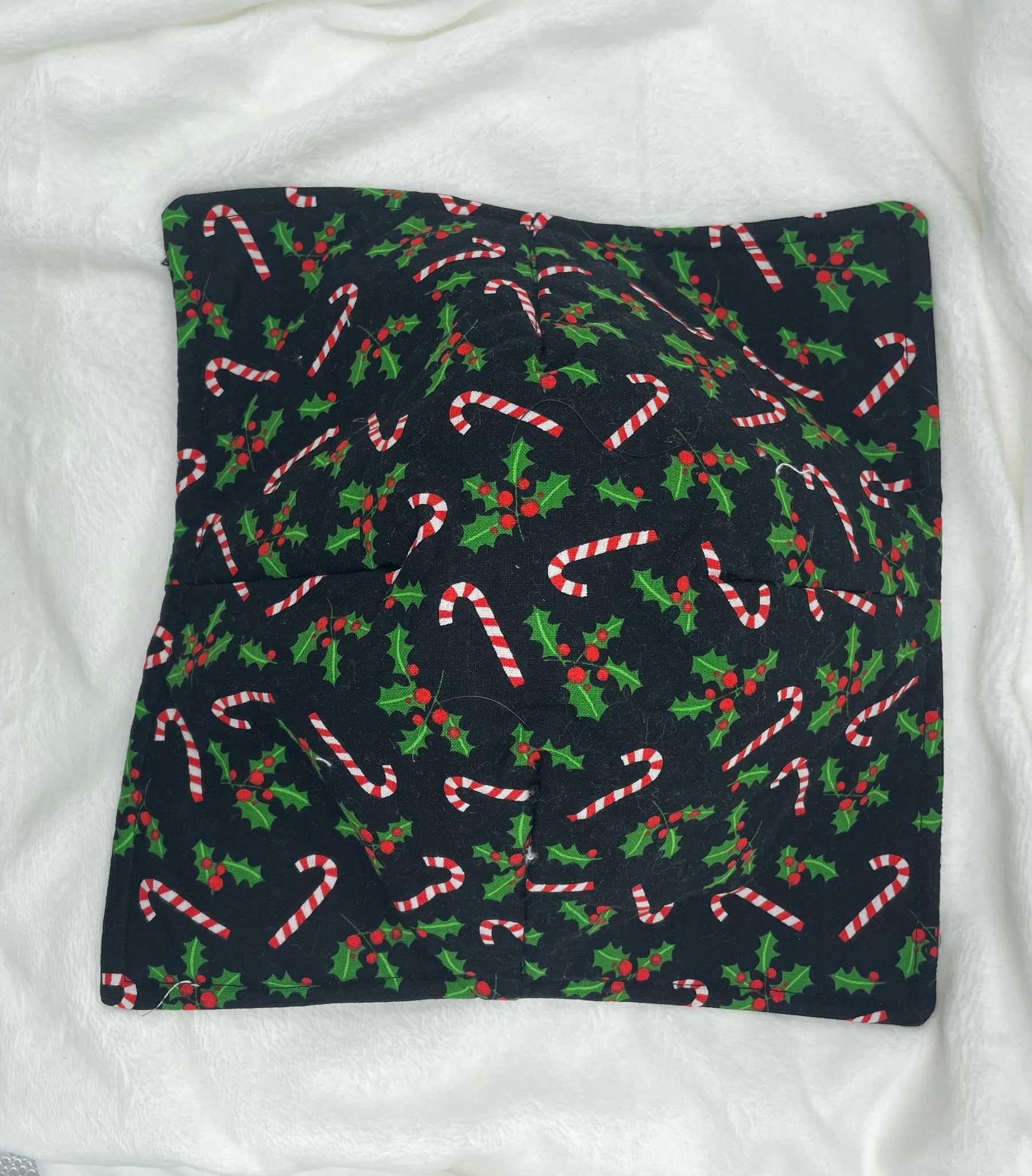 Keep your hands toasty and your holiday vibes extra sweet with this 100% cotton bowl cozie! With a bold black background and festive candy canes popping everywhere, it’s 4” deep and perfectly sized for a 12” square bowl—ideal for soups, stews, or any snack that deserves a little holiday flair.
